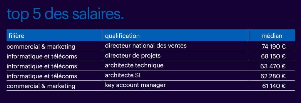 Les secteurs commercial & marketing et informatique et télécoms offrent les plus belles rémunérations en France grâce à ces deux postes qui se distinguent grassement. Il faut dire que, comme en 2022, la filière informatique et télécoms tire une nouvelle fois les salaires vers le haut au niveau national, avec une progression de +4,4% sur l’ensemble des salaires des cadres.